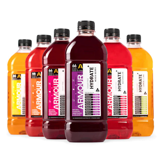 Body Armour Hydrate+ Liquid Concentrate - This advanced hypotonic blend features a full spectrum of key electrolytes—sodium, potassium, magnesium, and chloride—in a highly absorbable form for rapid hydration. Enriched with L-Theanine and B-vitamins, these concentrates support energy levels, cognitive function, and recovery, all without artificial colours, sweeteners, or flavours. Enjoy a clean, refreshing, Australian-made solution for both intense activities and everyday hydration needs.